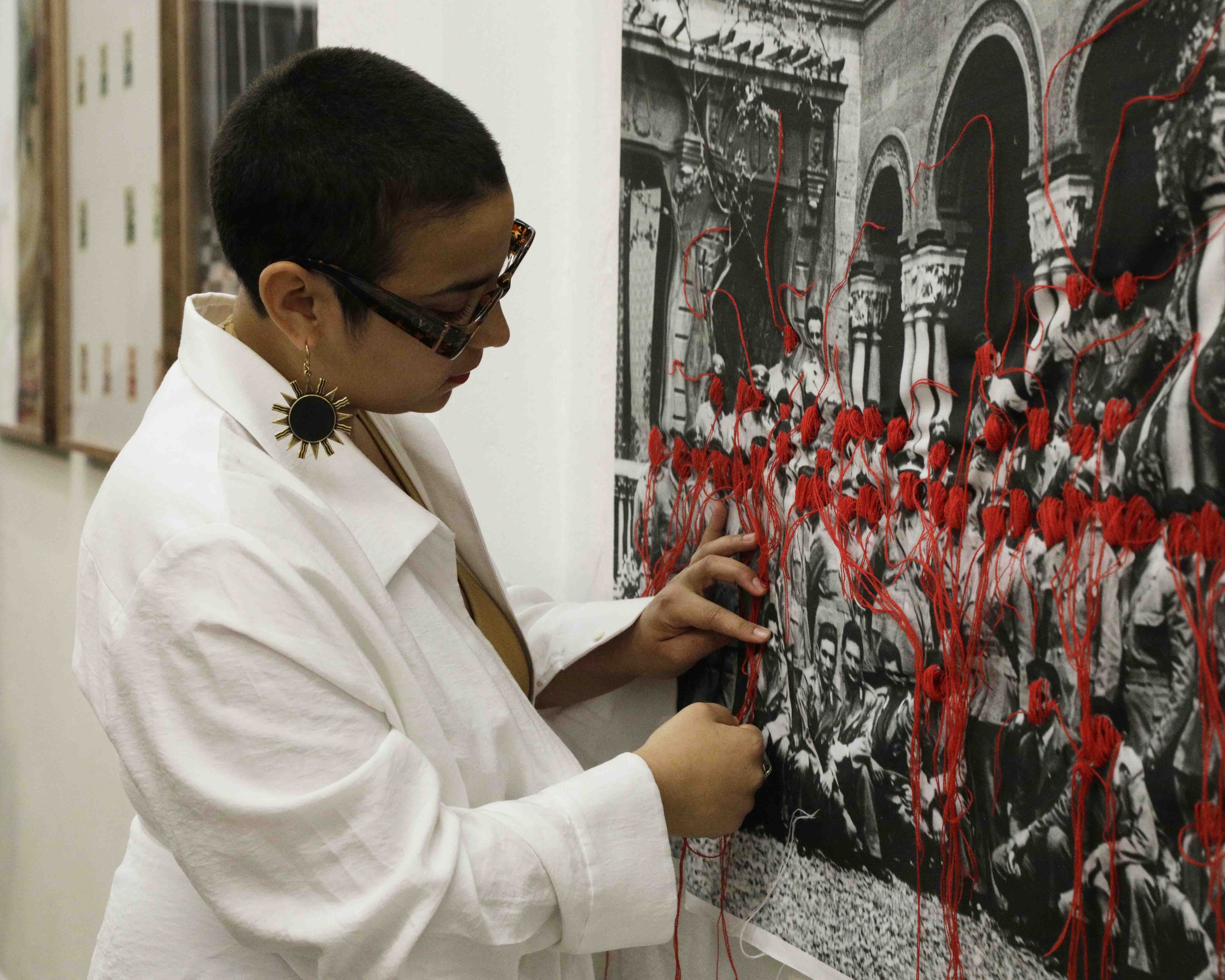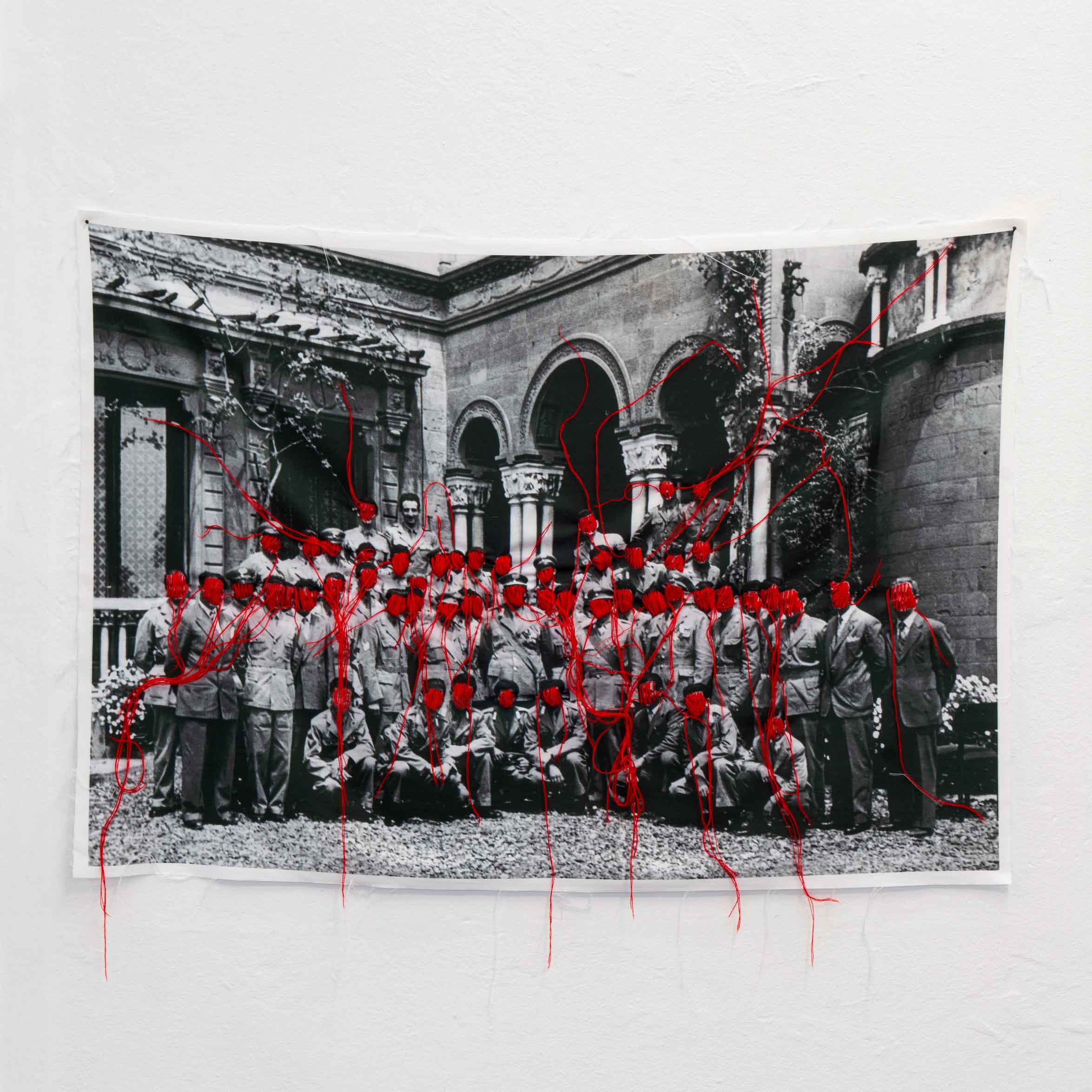 With the red thread sewing the faces of the soldiers, leaving only my father's uncovered, I wanted to symbolize the soldiers who have never returned or who have changed name and life to remain in Russia after the Second World War.