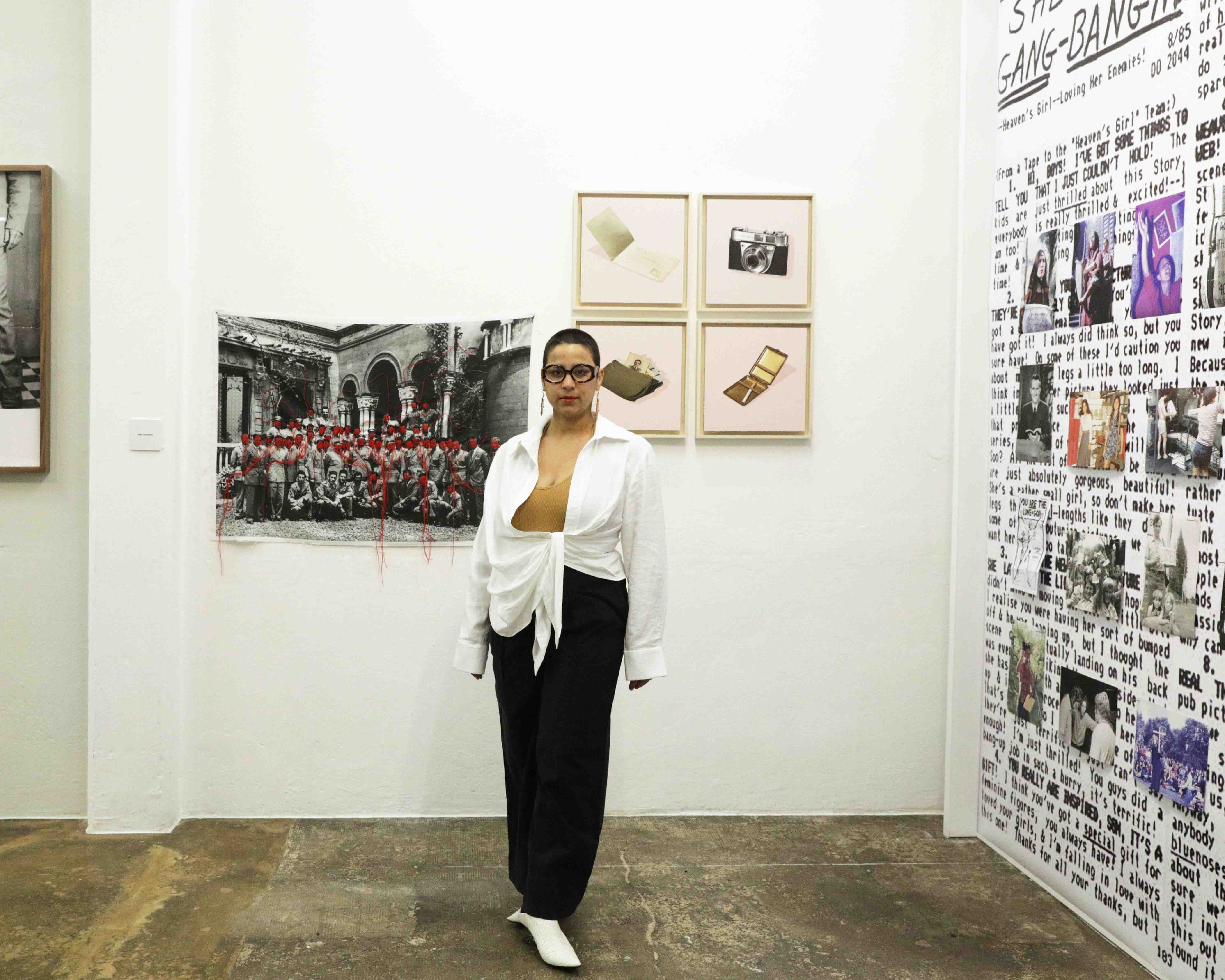 With the red thread sewing the faces of the soldiers, leaving only my father's uncovered, I wanted to symbolize the soldiers who have never returned or who have changed name and life to remain in Russia after the Second World War.